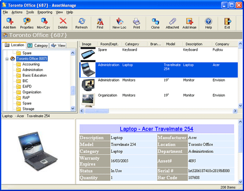 Use AssetManage asset tracking software to quickly and accurately inventory your company assets. You will be able to: keep track of the current location of your assets and whom they are currently assigned to; scan and print barcodes; maintain vendor info, asset disposals, employee data, and maintenance records; calculate Monthly and Annual Depreciation.