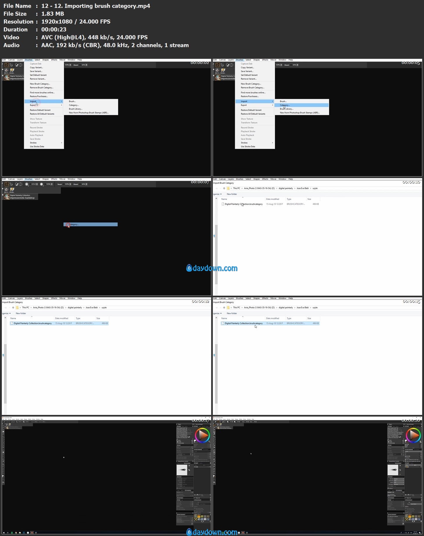 Works with Corel Painter 2019. It has been tested for software Corel Painter 2016 and later, for those -all brushes working, except “tree bark” and “rough knife cloner” which have substitute pointed in the course.