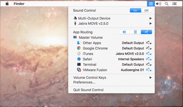 Sound Control lets users use a software volume mixer. Sound Control enables users to easily and quickly change app volumes as well as selectively apply a system-wide EQ to app audio. Sound Control does this by adding a software mixer to the menu bar of your Mac. In addition to the volume mixer, Sound Control also adds a software EQ to your audio output allowing users to easily tailor the sound of their Mac’s audio to their specific taste or to properly calibrate to the frequency response of their speakers.