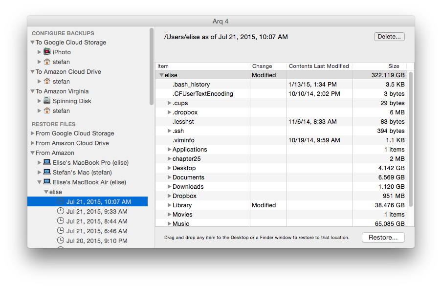 Arq keeps multiple versions of your files — a backup history. So if you discover a file was corrupted or accidentally deleted, you can go back and get the old version.