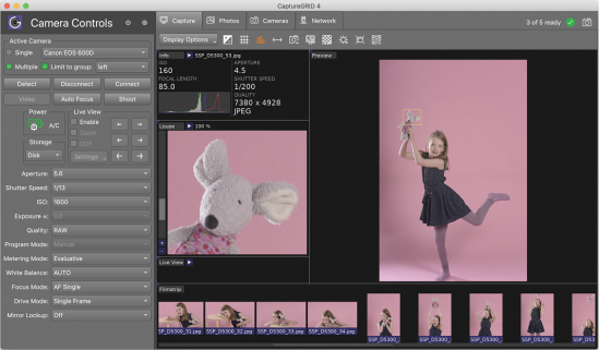 CaptureGRID 4 is a digital photography work flow application for tethered shooting, remote capture and advanced camera control. Multi-Camera Control allows you to fully control and synchronise all your cameras simultaneously, including camera settings, triggering, live view, photo download and filename management. Networked Operation across multiple computers allows you to scale up the number of cameras and orchestrate large multi-camera capture rigs.