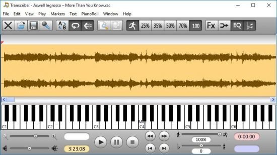 Conventional music players (whether hardware such as a CD player or an iPod, or software such as Windows Media Player or iTunes) are really designed for people who want to listen to whole tracks. They are very inconvenient for transcribing music as they are not designed for this purpose. If you copy the recording to your computer’s hard disk as a sound file then you can use Transcribe! instead. Transcribe! offers many features aimed at making the transcription job smoother and easier, including the ability to slow down music without changing its pitch, to analyse chords and show you what notes are present, and the capability of adding markers and textual annotations so you can easily navigate around the track. Transcribe! also has a piano keyboard displayed on screen which you can click to play reference notes.