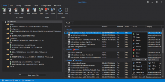 ApexSQL Job is a powerful database administration tool used for SQL Server Agent job management on multiple servers. It allows SQL Agent jobs to be created, edited, deleted or disabled easily from the central location. Detailed history of SQL Agent jobs run on the managed servers is presented in detail, in both graphical and tabular view, which allows easy detection of the failed jobs. The reports on Agent job history can be easily created and exported to CSV, XML, HTML or PDF formats. SQL Server and SQL Server Agent services are easily controlled through the application’s server pane. SQL Server Agent logs can be easily viewed, organized and filtered to determine potential issues in functioning of SQL Agent service or SQL Agent job execution. The application also allows quick and straightforward management of schedules, alerts and server operators.