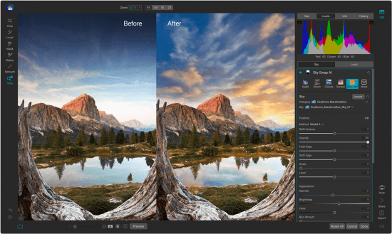 Sky Swap AI makes replacing or enhancing a dull sky a breeze. It detects the sky in your photo and creates a gorgeous mask automatically. Simply select from one of the 231 included skies or import your own. 125 of the built-in skies are sourced from OcuDrone, a leading provider of ultra-high resolution aerial images. Sky Swap AI combines machine learning with amazing curated skies to eliminate the need for complex masks and layers normally required in other editing apps………