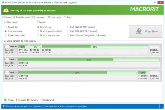 Wipe non-system disk all partitions on HDD or SSD with one click