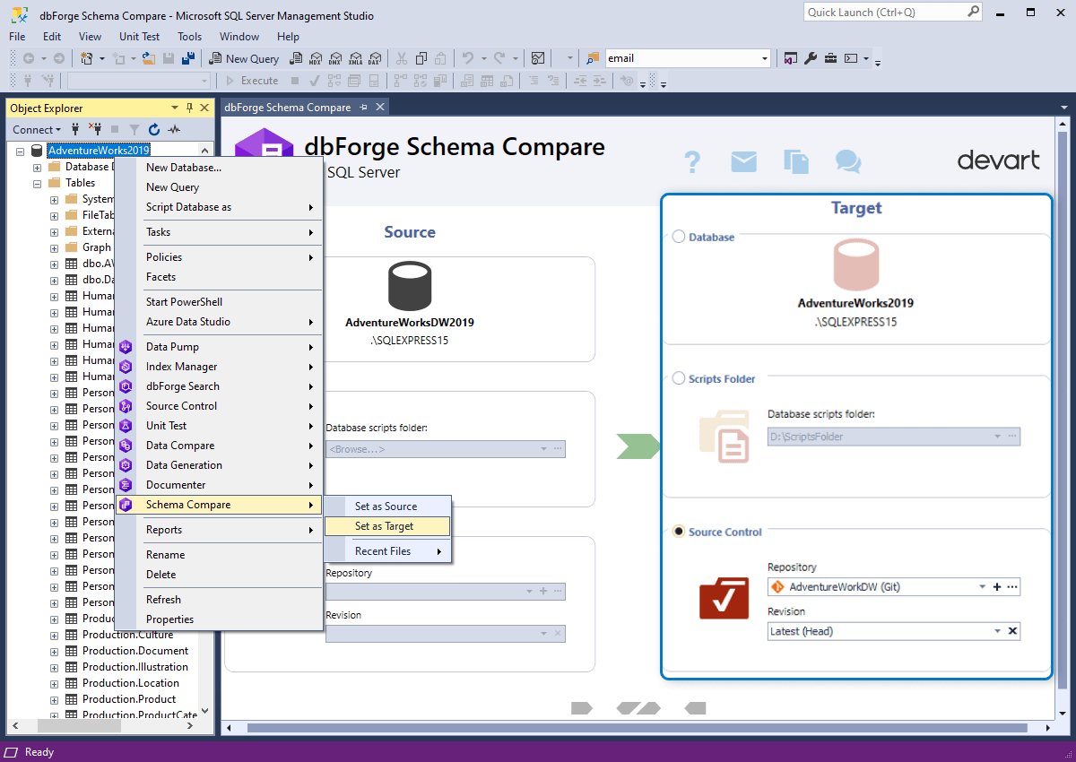 dbForge Schema Compare for SQL Server is a reliable database schema comparison tool that saves you time and effort when comparing and synchronizing SQL Server databases. SQL Compare allows you to work with live SQL Server databases, snapshots, script folders, and native backups.