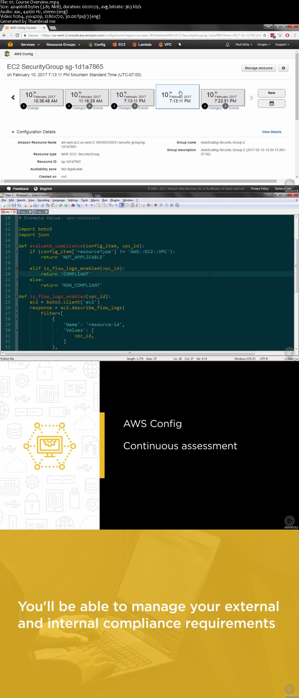 Companies of every size are increasingly seeing a need to monitor their AWS infrastructure’s compliance to certain industry standard rules like CIS and HIPAA, or even their own internal requirements. In this course, Managing Inventory, Change, and Compliance with AWS Config, you’ll learn how to manage all your compliance needs with an AWS-native tool: AWS Config. First, you’ll learn how to setup AWS Config and use it to track your resources state both current and past. Next, you’ll learn how to use AWS Config Rules to continuously evaluate that state with respect to your compliance goals. Finally, you’ll learn how to implement continuous compliance, turning your state evaluations into actions that repair your infrastructure automatically. When you’re finished with this course, you’ll have all the necessary skills and knowledge to confidently report on your compliance state at any time, while being confident that any compliance issues will be resolved without you lifting a finger.
