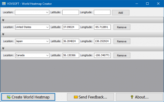 World Heatmap Creator creates a world map in HTML format and marks all the locations you choose. The software displays a drop-down list of all the countries in the world, storing a specific location for each. You have to select the desired locations and add them to your list alongside the corresponding latitude and longitude. If you decide to modify the two latter parameters, you will get a custom location on the map.