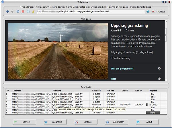 TubeDigger is a powerful and easy-to-use online video downloader from mostly any media site including sites where many other downloaders will give up. Even if your connection speed is slow downloader tries to detect any possible bitrates/resolutions of online video and to download for you video of the best quality. Integrated free media converter is simple in use and contains all required nowadays formats with possibility to adjust converting quality automatically. Downloader may also work as a recorder of live streams and specially for this it has two methods for fixing recorded FLV files. For geo-blocked sites use VPN services or SOCKS proxies to obtain IP address of the corresponding country.