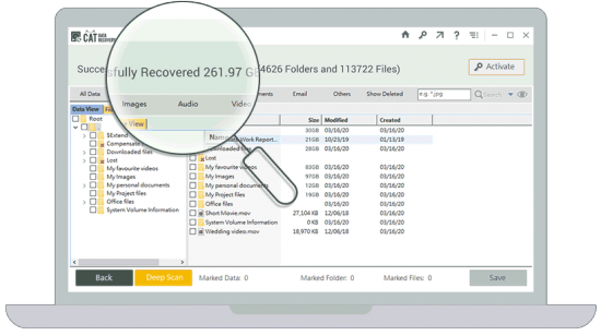Data loss scenarios vary from simple cases like accidentally deleting files to complex cases like formatted partitions or lost Mac volumes. CAT Data Recovery Software is built with a powerful data recovery algorithm for severe data loss scenarios. The tool can seamlessly recover hundreds of Gigabytes after data loss scenarios ranging from accidentally deleted or lost to the formatted or deleted partitions.
