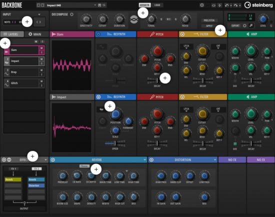 Backbone is your new, innovative drum designer for single kicks, snares, hi-hats, percussion, rises, hits and more. Layer up to eight samples and shape them with classic subtractive synthesis, decompose samples into tonal and noise elements, re-synthesize samples to manipulate them in unheard ways and apply up to eight effects with two fully routable buses — all with a slick, extremely fast interface. Backbone takes your drums into a whole new era of sound design — the era of drum re-synthesis!