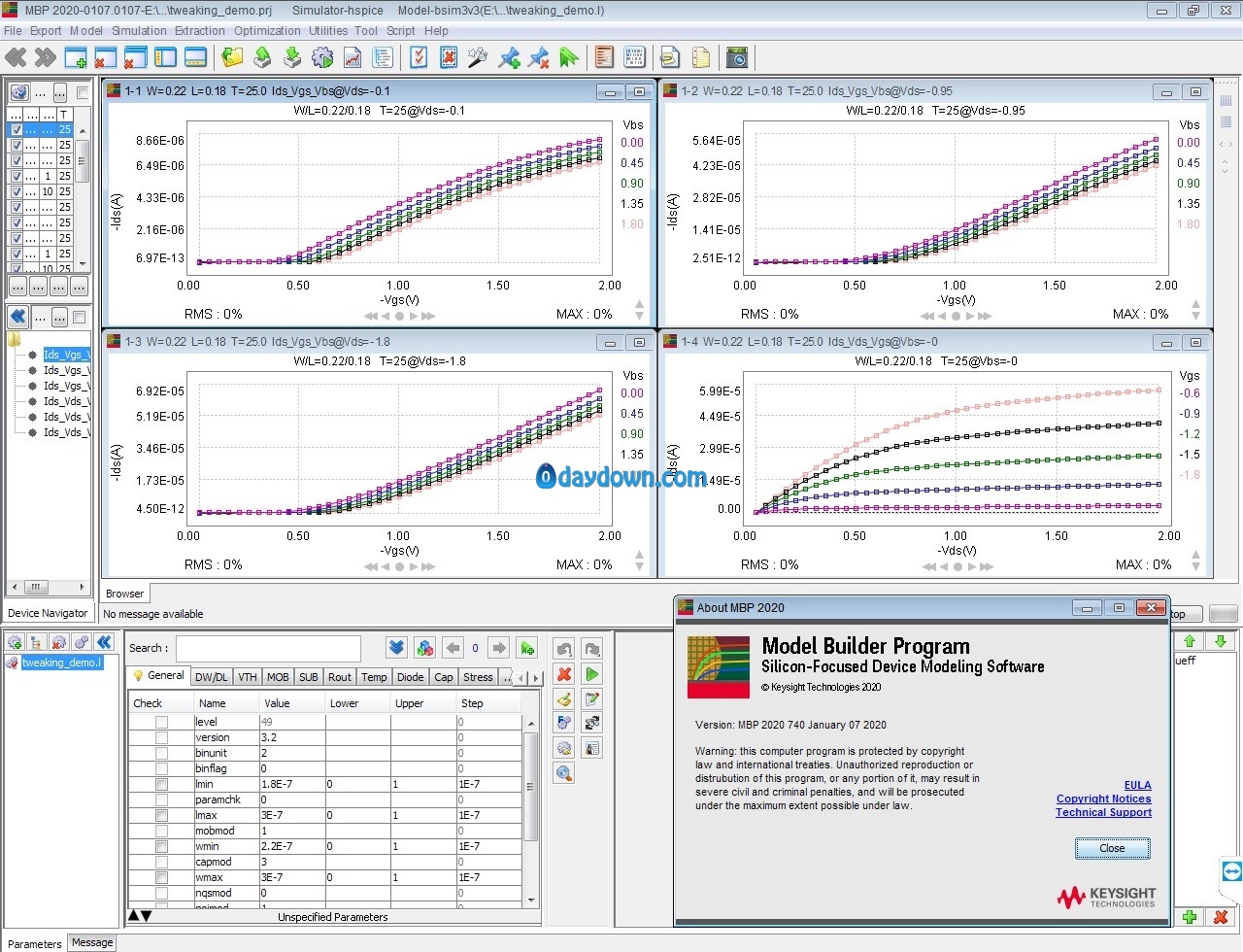Model Builder Program (MBP) is a complete modeling solution that integrates SPICE simulation, model parameter extraction and model library generation. MBP supports the latest standard models including BSIM-BULK, BSIM-CMG and BSIM-IMG for logic, analog and RF designs. Besides compact models, MBP also supports the macro (subcircuit) model and Verilog-A model.