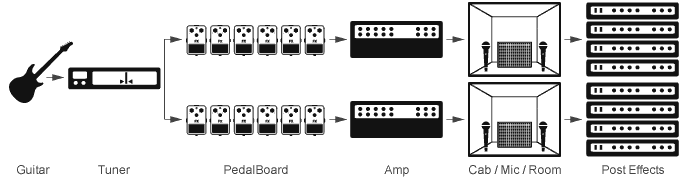 有八种不同的串联/并连“路由线路”选择,让你能对整个的信号连进行控制。根据每个不同的场景来设置音色。你可以任意选择不同的配置,例如:双踏板连接单个前置功放头,分别连接两个箱体,使用不同的麦克风,每个连接一款带有压缩和图像均衡机架。可以像这样进行无限的组合。
