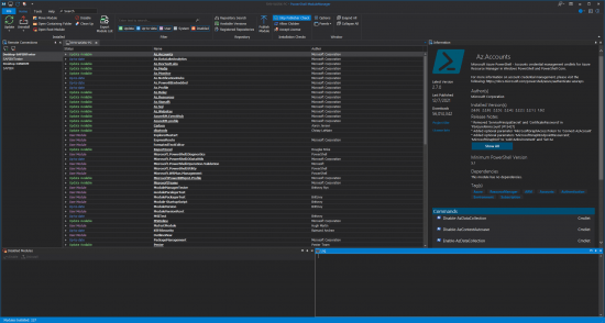 PowerShell ModuleManager also allows you to easily see module information such as descriptions, release notes, version information, tags, dependencies, and commands. Search repositories, like the PowerShell Gallery, to install new modules and see details about the module to help you decide if this is the module for your needs.