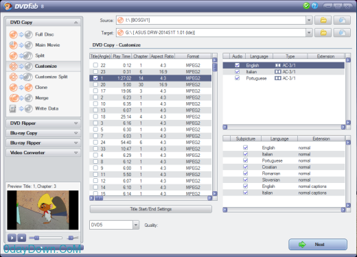 DVDFab is the most powerful and flexible DVD copying/burning software. You can back up any DVD to DVDR in just a few clicks. DVDFab is brand new, is completely rewritten, is based on more than 8 years of DVD copy software development. DVDFab is simply the easiest way to copy a DVD movie. Just insert the movie and a blank DVD then press Start. Your entire movie – including menus, trailers and special features – is copied to a single DVD with just one click, and everything happens automatically. Backup your entire DVD – including menus, trailers, and special features – onto one or multiple discs.
