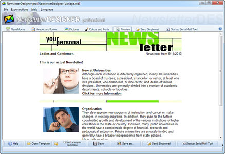 Design your newsletter like the professionals. You can easily integrate Pictures, Links and Design Elements. NewsletterDesigner Pro also includes Ready-to-use Templates and Layouts for your Newsletters. Corporate users can create Templates in your very own design and use them for every newsletter. You even can produce newsletters by company department or individual personnel for a more personal touch.