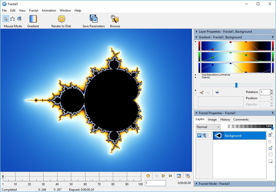 Choosing parameter values is a breeze with the new Explore feature. Experiment with new parameter values by moving the mouse cursor over a coordinate grid in the Explore window, while the Fractal Mode tool window shows a real-time preview of the result.