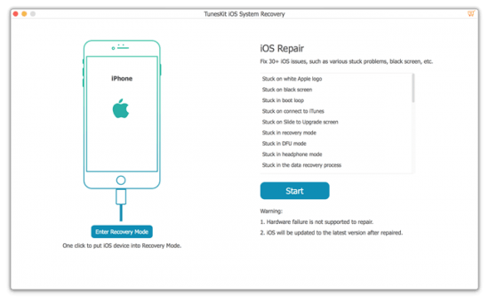 With TunesKit iOS System Recovery, you are able to quickly fix any common iOS issue all by yourself without seeking for help from Apple technical specialist. No matter whether your iOS device stuck in recovery mode/DFU mode/white Apple logo, or becomes black/blue/frozen/disabled screen, this smart iOS repair tool will get you out of the trouble and recover your device back to normal easily and efficiently.