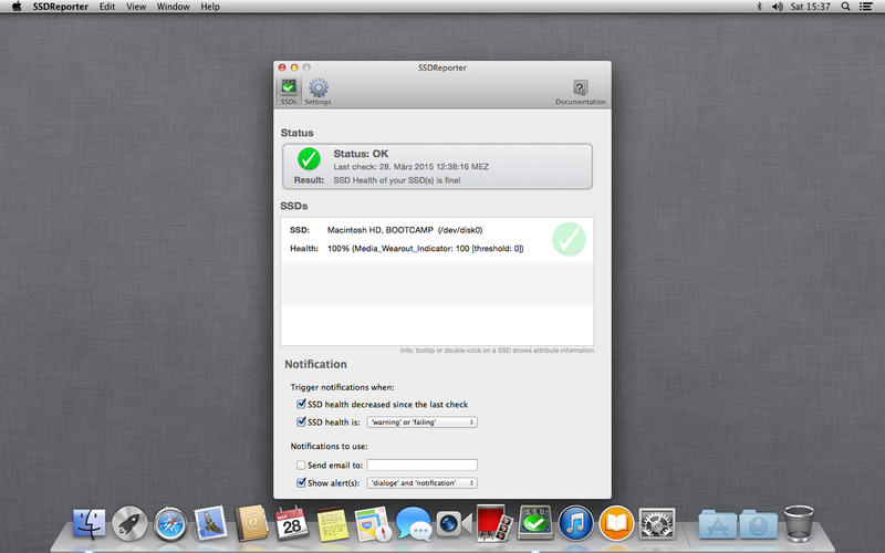 SSDReporter is an application that checks the health of your internal Solid State Disks (“SSD” aka “Flash Storage”). Since SSDs have a limited life-time determined by the number of write operations it is important to keep an eye on your SSD status. SSDReporter can warn you by e-mail or on-screen each time the health of your SSD decreases and/or when the health falls below the ‘warning’ or ‘error’ thresholds. The current status of your SSDs is also always easily recognizable because SSDReporter changes its icon (optionally in the menubar) from green to yellow (warning threshold) and finally red (error threshold) as the SSD health decreases.