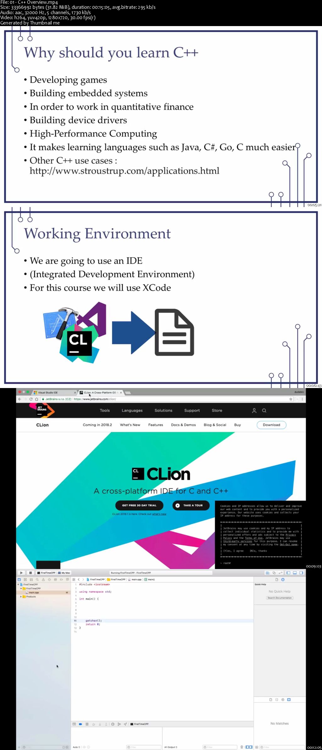 C++ Overview. This first video in the C++ Fundamental series provides a short introduction to the world of programming, and then highlights the properties of C++ that make it stand apart from other languages such as high performance, low level access to memory, and portability. We cover C++ use cases including developing games, building embedded systems, working in quantitative finance, building device drivers, enabling high-performance computing, and more. We will show you how to set up the C++ environment on any operating system. We will be using Xcode and the Microsoft Visual Studio Integrated Development Environment (IDE). By the end of this first clip, you will have created your “Hello World” program.