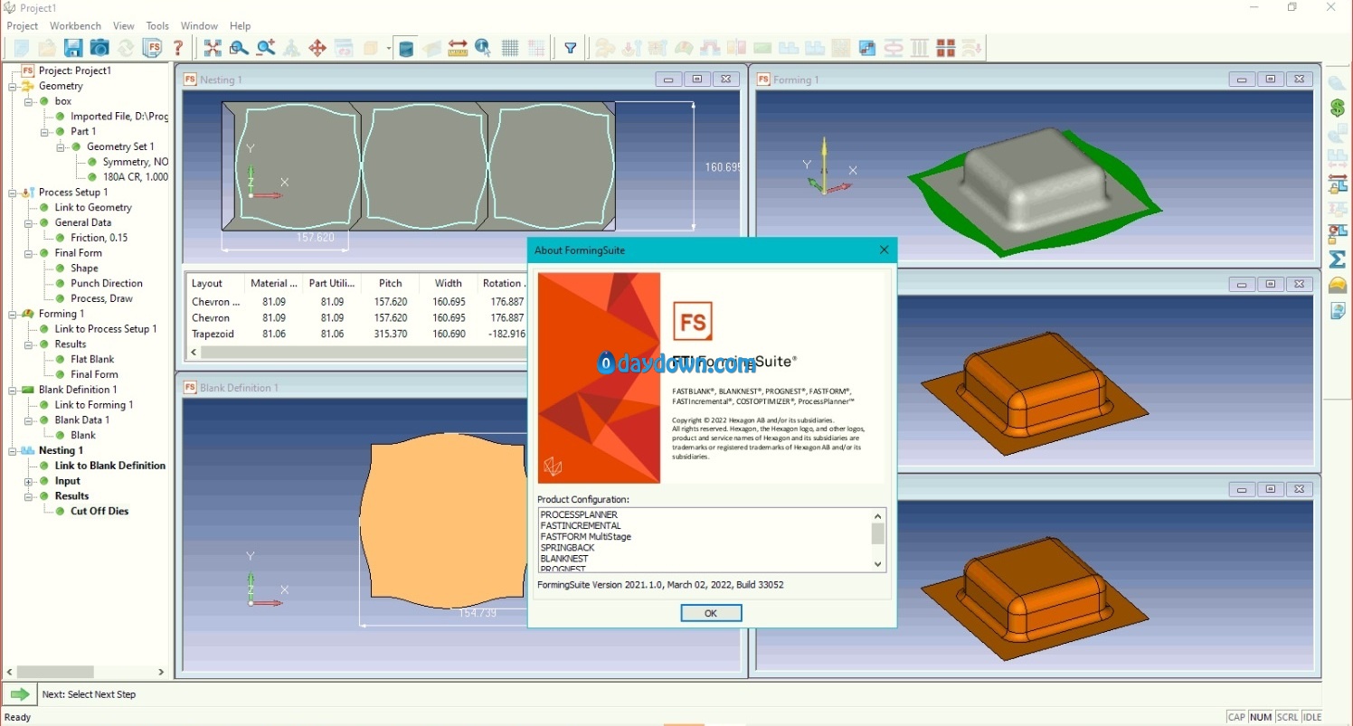 FormingSuite is a user friendly combination one-step, implicit, and explicit incremental analysis solution that provides a complete virtual die develop-ment and tryout for tool and die makers. It requires no FEA background. It offers many advanced features such as automatic blank shape, and location, automatic process setup and automatic binder closing and wrap.