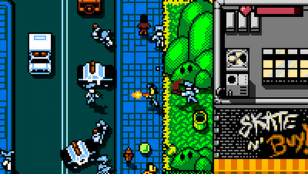 游戏类似横行霸道的沙盘型游戏,视角和画面风格也和掌机上的横行霸道作品比较相似。游戏中充满了经典8位游戏的影子,你可以像《赤色要塞》般驾驶战车冲进敌人基地营救同伴,也能像魂斗罗那样奋勇杀敌,甚至还能拥有《希魔复活》中的高科技勾爪。如此给力的8bit复古作品怎能不让老玩家心动呢?!