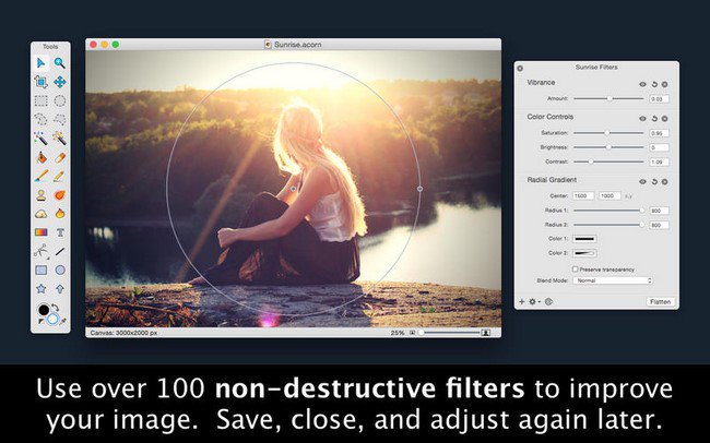 Acorn merges layer styles and filters together into one happy UI. Combine filters together to create endless combinations of unique effects knowing you can always change your mind later on. Customize your own presets and use the on-canvas controls to get things looking just right.