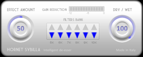 Sybilla has just two knobs, since the frequency detection is done automatically to always catch the most critical part you only have to decide how much the de-esser should work on those frequencies and if you like some of the original signal mixed in.