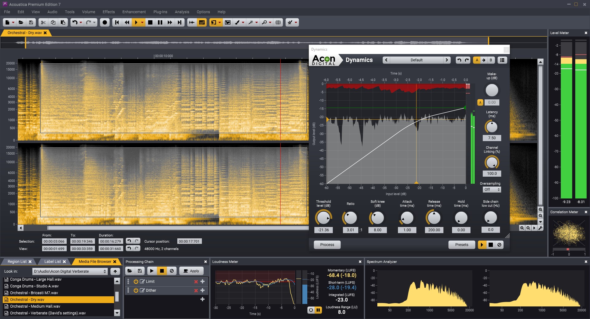 Re-implemented from scratch for the highest quality demands and cross-platform support, Acoustica 7 is now the perfect tool for editing, mastering and restoration work on both Mac and PC (32 and 64 bit). The new spectral editing mode available in the Premium Edition allows more precise restoration work while you have access to processing tools from our award winning plug-ins such as Equalize, Verberate and Restoration Suite.