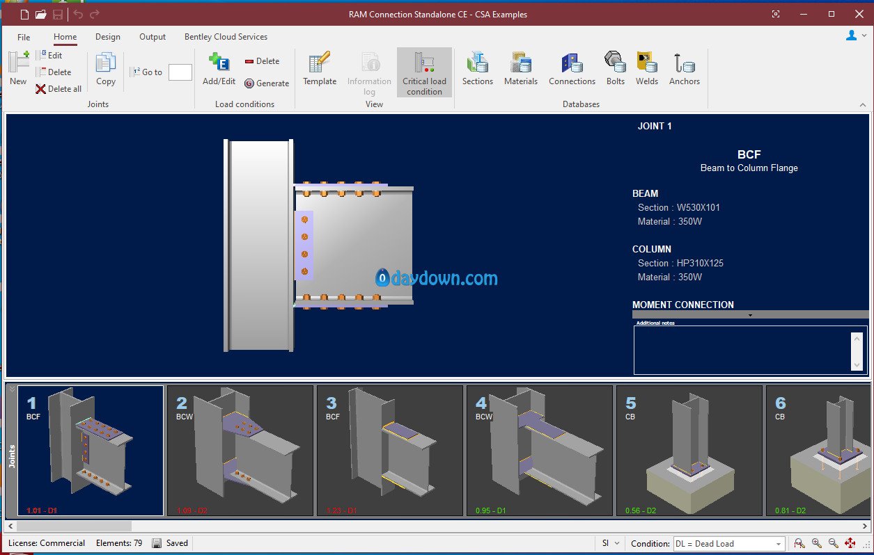 RAM Connection is the ideal solution when structural engineers or designers need to check a specific connection, design a single connection for multiple joints, or optimize each connection in a structure. Analyze, design, and verify structural steel connections, all with comprehensive calculations, including seismic compliance. RAM Connection can check or design connections in seconds. Whether you design connections or need to check connections designed by the shop, RAM Connection is the software for you. In just one low-cost package, you get for steel frame connections the AISC ASD and LRFD, AS 4100-1998, BS5950-1, CSA S16-14, EN1993-EC3, GB50017 and IS800 connection design and optimization for shear and moment connections, braced frame connections, splices, and horizontal bracing connections. For truss connections you get the tubular connections design according to the AISC and the HSS Connection Design Manual. Through its seamless integration with the RAM Structural System, RAM Elements, and STAAD.Pro, RAM Connection raises the bar to a new level of productivity. All data regarding member sizes, joint geometry, and forces are transferred directly from either the RAM Structural System, RAM Elements, or STAAD.Pro to RAM Connection.
