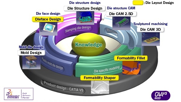 日本UNiSys与Toyata所合作,研发出来专门对汽车板金模具开发软体Cadceus(目前為Camasiter)。把Cadceus软体的专用模组 : Pressdesign ,Dieface ,Modeldesign 及其CAM加工模组,跟现在新的开发模组整合,支援CATIA v5 CAA,写成Dynavista 功能。 在Toyota 导入CATIA5后,以CATIA5 来开发鈑金件及鈑金模具流程,发现CATIA v5 有部份无法满足其工作需求,因此委託日本UNISYS 将其原先TOGO 係统具有之功能而CATIA 没有之部份工作上有需要但catia V5 没有或达不到之功能,在另外开发补强CATIA不足的地方。 有关功能以CATIA v5 CAA,写成Dynavista 功能 ,目前日本TOYOTA(Toyota Manufacture Center)已经使用范围的有: (1)鈑件设计导角 (2)鈑件反弹角计算 (3)模具Die face 设计 (4)3D 鈑金结构设计 (5)模座一次加工 (6)模具3 D 模面加工 (7)塑胶胶模设计